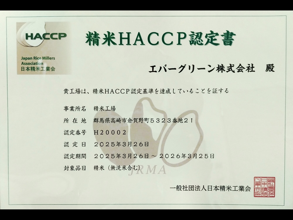 また、当精米工場は一般社団法人日本精米工業会による精米HACCP認証を取得しており、その基準に基づいた徹底的な衛生管理を実施しています。
