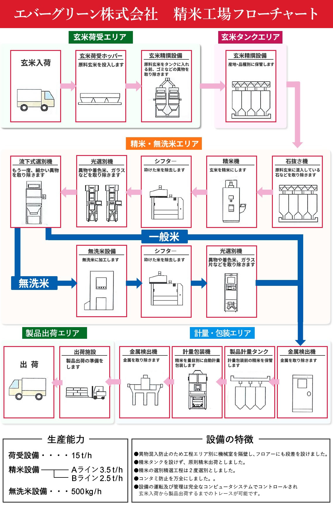 弊社精米工場は、2ラインで1日約30トンの製造能力があり、うるち米・もち米ともに、精米・無洗米にも対応しています。